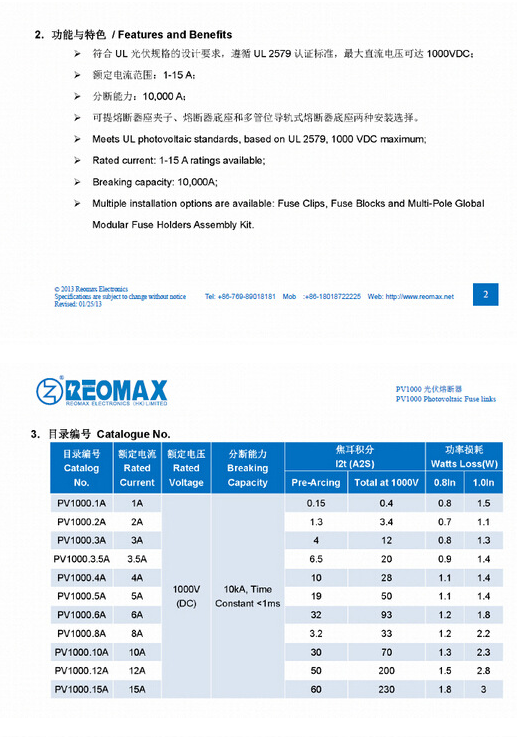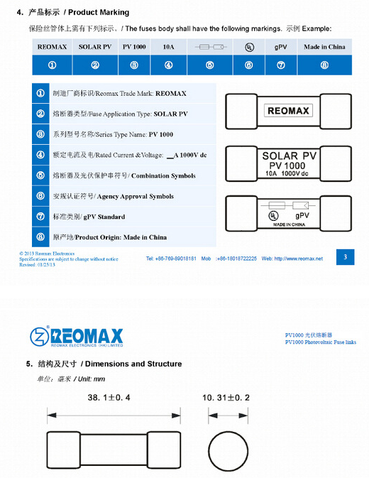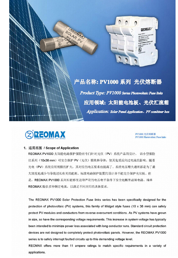 產品名稱: 1000Vdc REOMAX光伏熔斷器10X38mm PV1000
