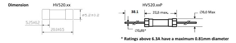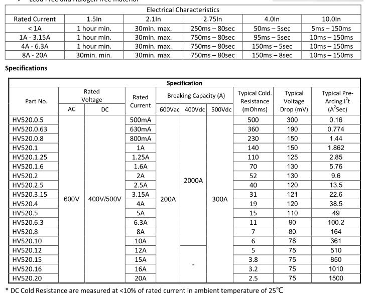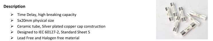 簡述: 5x20 fuse, according to IEC 60127-2, Time delay fuse. VOLTAGE RANGE: 600VAC, 400V/500V DC AMPERE RANGE: 500mA ~ 20A INTERRUPTING RATING: 500mA-20A 200A@600Vac 500mA-10A 2000A@400Vdc 12A-20A 300A@500Vdc