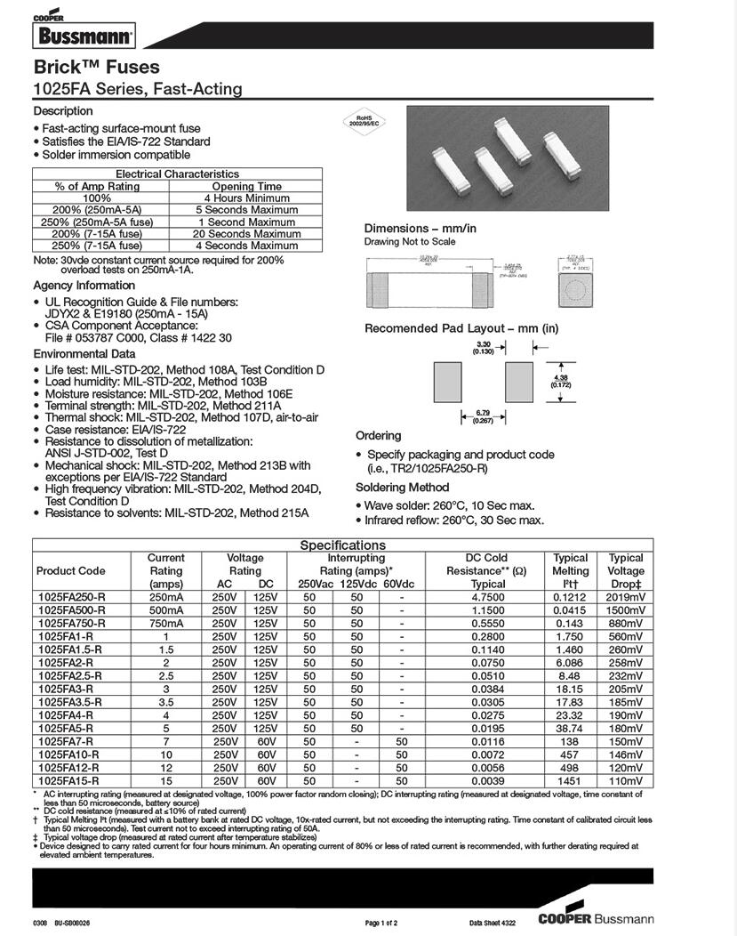 產品名稱: BUSSMANN 1025FA貼片式保險絲 快斷 250V