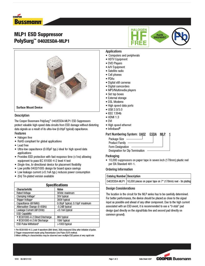產品名稱: bussmann 0402ESDA_MLP1 ESD 微型貼片保險絲 貼片保險絲
