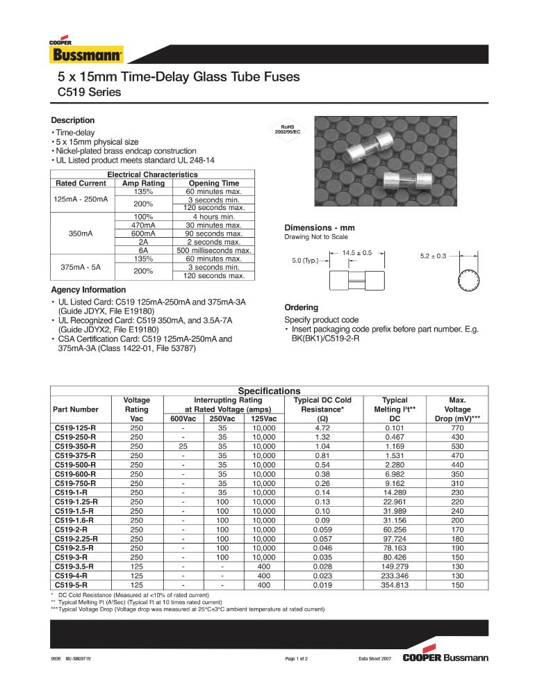產品名稱: 巴斯曼保險絲 C519 5*15MM 慢斷保險絲