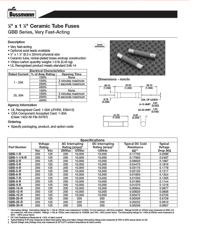 產品名稱: GBB 綠色陶瓷管 250Vac 電流陶瓷保險絲