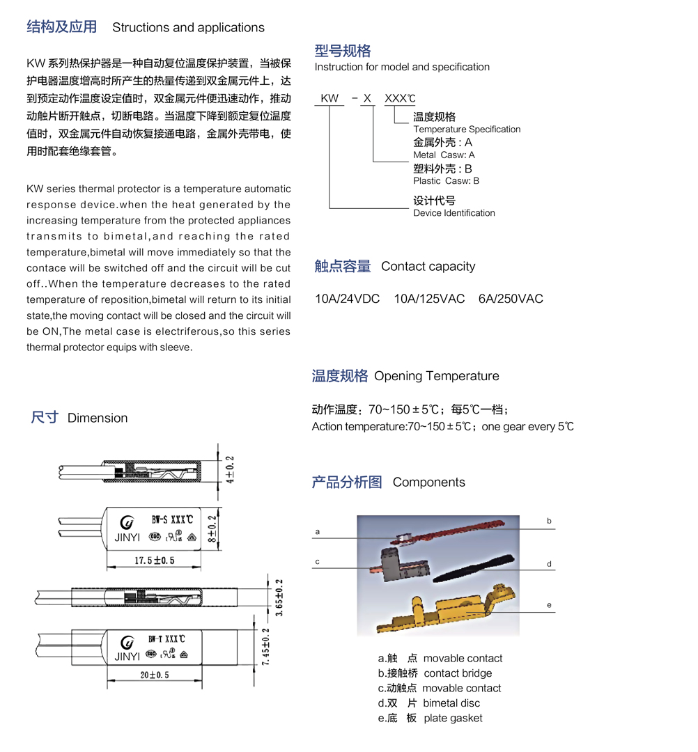 簡述: KW 系列溫控器 KW series thermal protector 溫度開關 溫度開關廠家 溫度開關生產廠家?