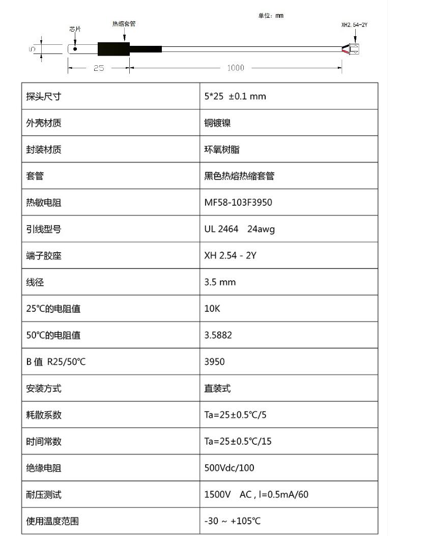 產品名稱: NTC溫度傳感器 防水型密封溫度探頭 兩芯護套線 XH2.54端子