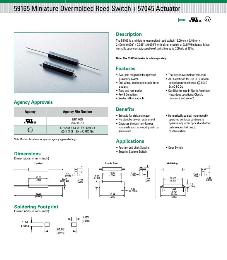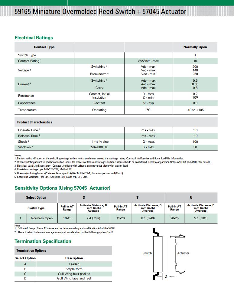 簡述: 59165 系列 - 微型包覆成型磁簧開關|HAMLIN|干簧管