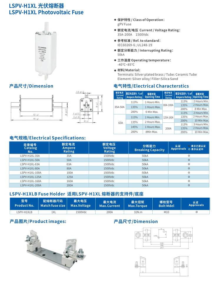 產品名稱: 光伏熔斷器 LSPV-h1xl 1500VDC Photovoltaic Fuse