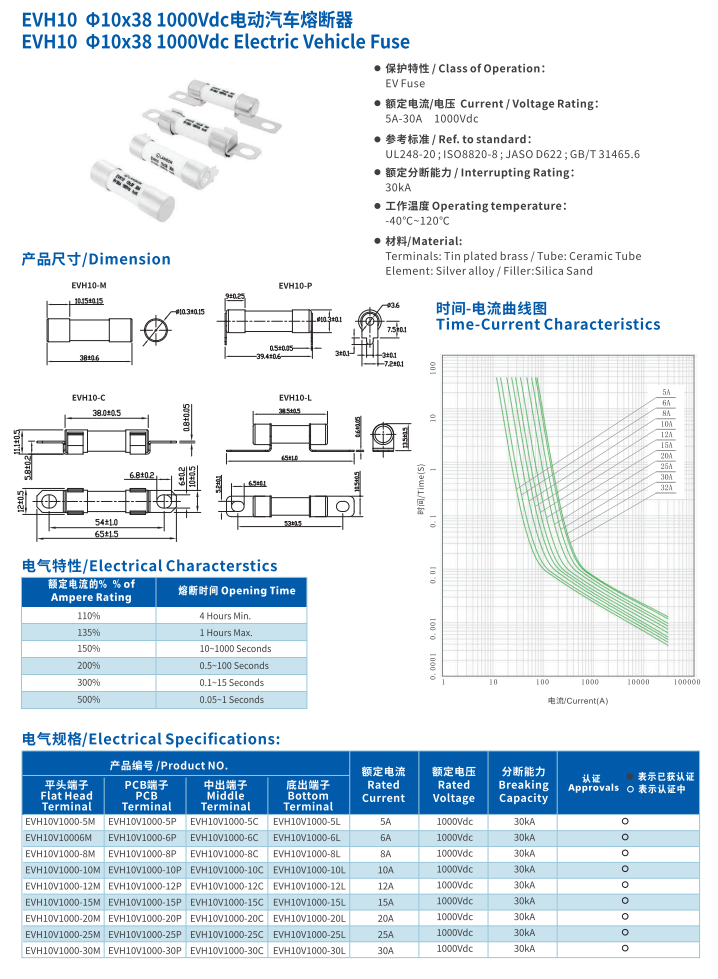 產品名稱: 電動汽車熔斷器EVH10 10*38 1000VDC Electric Vehicle Fuse